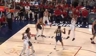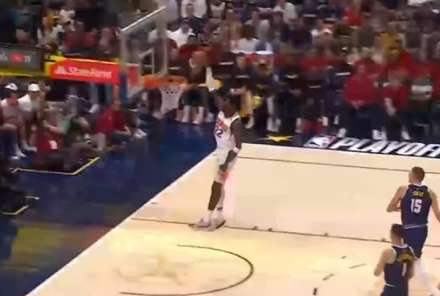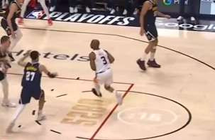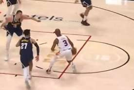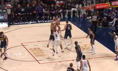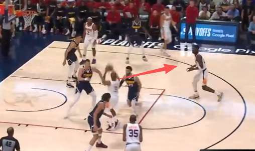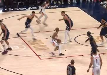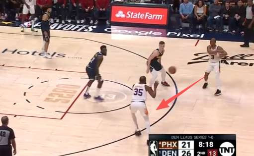 KD抓掘金换防时间差快拆至左翼获得出手空档,保罗人到球到助其命中接球三分。