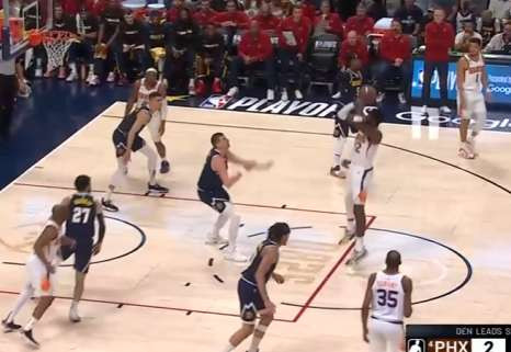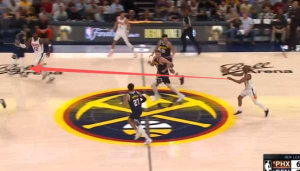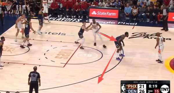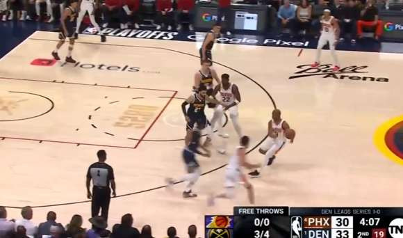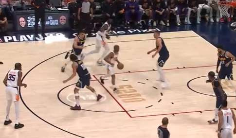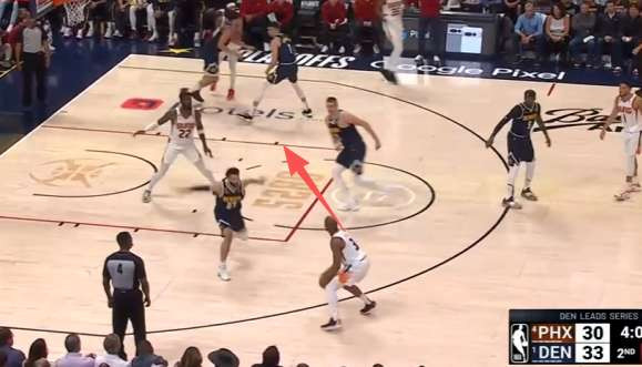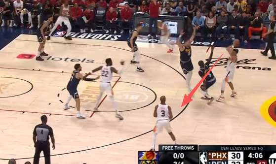 行进间布克吸引双人夹击,阅读到默里放空保罗垫防顺下艾顿后,立即出球给左翼空位的保罗