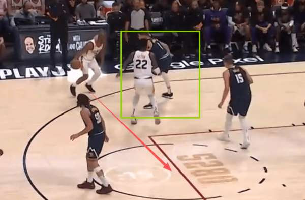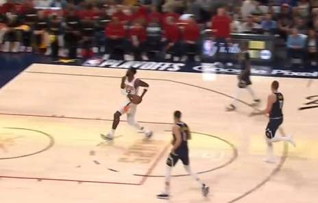 挡拆行进间面对深度沉退的约基奇,突破行进至罚球线横向上步使用一二步急停